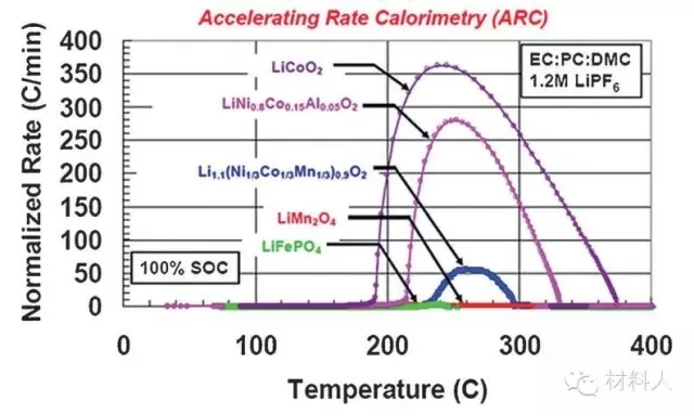 鋰電池電極材料的安全性能是鋰電池的一個重要的評價指標,也是決定鋰電池品質是否過關的一個重要因素。安全性能往往體現在熱穩(wěn)定性上面,如圖2所示:同等條件下,鈷酸鋰的熱穩(wěn)定性最差,NCA、NCM次之,錳酸鋰熱穩(wěn)性較好,磷酸鐵鋰熱穩(wěn)定性最好。