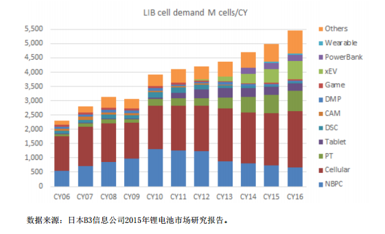 此外,日本B3信息咨詢公司2015年發(fā)布的鋰電市場分析報(bào)告顯示,以鋰電池電芯數(shù)量出貨量計(jì)算,2015年全球鋰電同比增長約11.02%,考慮到單顆電芯的容量穩(wěn)定上升及動(dòng)力鋰電的迅速發(fā)展,過去十年,鋰電正極材料行業(yè)保持了24%的復(fù)合增長率,2015年鋰電正極材料出貨量達(dá)到15.4萬噸。鋰電池在智能手機(jī)、電動(dòng)工具、電動(dòng)汽車等應(yīng)用領(lǐng)域發(fā)展樂觀。2006年~2016年鋰電池應(yīng)用領(lǐng)域發(fā)展趨勢見下圖: