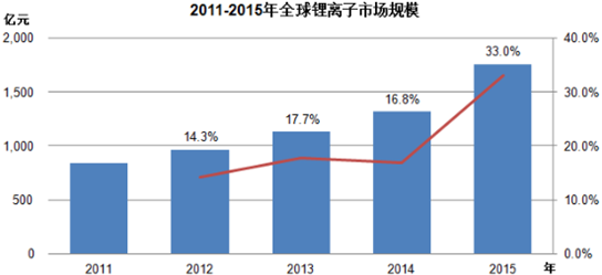 中國儲能網(wǎng)訊:雖然近年來世界經(jīng)濟頻繁波動,2008 年以來相繼發(fā)生金融危機、歐債危機,但是隨著數(shù)碼類電子產(chǎn)品和新能源動力類產(chǎn)品的得到廣泛應(yīng)用和普及,鋰電池產(chǎn)業(yè)已經(jīng)發(fā)展形成專業(yè)化程度高、分工明確的產(chǎn)業(yè)鏈體系,全球鋰離子電池市場仍然取得了較快增長。全球鋰電池市場規(guī)模從2011 年的 840 億元增至 2015 年的 1,755 億元,年均復(fù)合增長率達到 20.2%,全球鋰離子電池市場保持穩(wěn)步增長態(tài)勢。