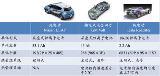 以三款經(jīng)典的電動(dòng)汽車日產(chǎn)LEAF、雷諾和特斯拉為例,三家汽車廠商基于產(chǎn)品的定位、電池技術(shù)掌握程度等多方面的因素,選擇的電池種類、容量、個(gè)數(shù)和熱管理系統(tǒng)就大相徑庭(詳情參見下圖)。特斯拉的優(yōu)勢(shì)在于電池管理系統(tǒng),短板在于單體電池領(lǐng)域的積累不足,因而選擇直接從松下購(gòu)買技術(shù)成熟度高、一致性好的18650型電池;而日產(chǎn)從材料解析到單體電池設(shè)計(jì)再到模組管理都有豐富的經(jīng)驗(yàn),因而選擇容量較大的層疊式鋰離子電池。