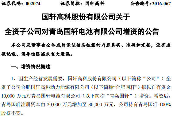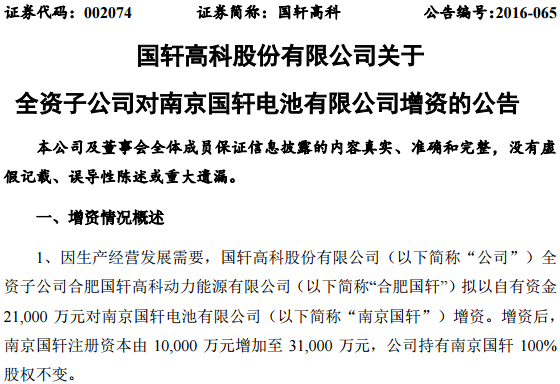 同時(shí),國(guó)軒高科還公告,子公司合肥國(guó)軒擬以自有資金增資青島國(guó)軒電池有限公司(以下簡(jiǎn)稱(chēng)“青島國(guó)軒”)、南京國(guó)軒電池有限公司(以下簡(jiǎn)稱(chēng)“南京國(guó)軒”)、國(guó)軒新能源(蘇州)有限公司(以下簡(jiǎn)稱(chēng)“蘇州國(guó)軒”)各1億元:合肥國(guó)軒擬以自有資金10,000萬(wàn)元對(duì)青島國(guó)軒增資。增資后,青島國(guó)軒注冊(cè)資本由20,000萬(wàn)元增加至30,000萬(wàn)元,公司持有青島國(guó)軒100%股權(quán)不變;合肥國(guó)軒擬以自有資金21,000萬(wàn)元對(duì)南京國(guó)軒增資。增資后,南京國(guó)軒注冊(cè)資本由10,000萬(wàn)元增加至31,000萬(wàn)元,公司持有南京國(guó)軒100%股權(quán)不變;合肥國(guó)軒擬以自有資金10,000萬(wàn)元對(duì)蘇州國(guó)軒增資。增資后,蘇州國(guó)軒注冊(cè)資本由10,000萬(wàn)元增加至20,000萬(wàn)元,公司持有蘇州國(guó)軒100%股權(quán)不變。