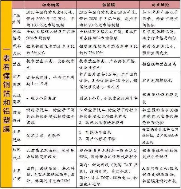說到這,我們不禁要把鋁塑膜與近期市場關注較多的銅箔(鋰離子電池負極材料載體)作一比較,來個“一表看懂”,如下。
