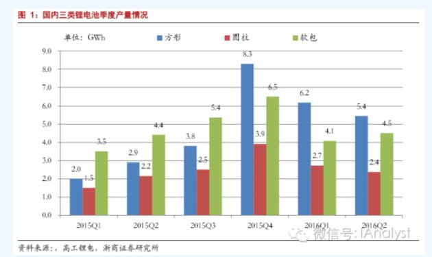方形電池方面,16Q2產量明顯下滑主要是因為數碼電池市場軟包繼續(xù)替代方形和圓柱,之前的鋁殼數碼廠如維科、振華、天勁等逐漸放棄方形路線,轉為軟包或動力圓柱電池,另外方形動力電池需求量也有所減少。