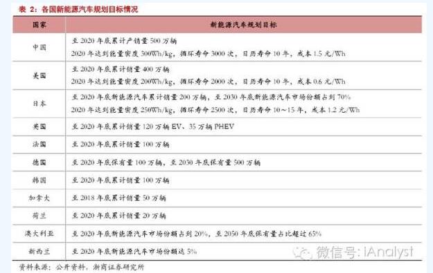 全球主要國家新能源汽車規(guī)劃目標統(tǒng)計如表2所示,到2020年合計保有量目標超過1600萬輛,其中中國規(guī)劃到2020年實現(xiàn)500萬輛保有量的目標,可見“十三五”期間新能源汽車領域對鋰電池的需求量將呈現(xiàn)井噴態(tài)勢。