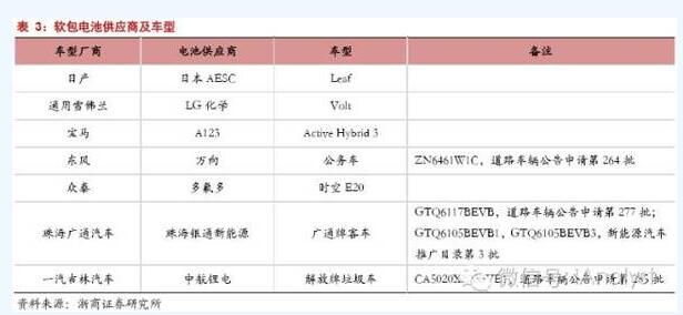 全球動力電池廠商中有超過6成采用了方形電池結構,代表車型包括三菱iMiEV,寶馬i3,豐田Pruis等;而特斯拉Model S采用的松下18650型電池則是圓柱動力電池的代表;軟包電池的占比高于圓柱,代表車型則是日產Leaf、通用雪佛蘭Volt、寶馬等,如表3所示,主要供應商有日本AESC、LG化學、A123等。