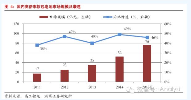 據統(tǒng)計,2015年軟包電池在手機電池和筆記本電池兩大3C應用領域的滲透率都已達到60%以上,而2009年的數據分別10.7%、7.6%,軟包聚合物鋰離子電池為其主流應用形式。(三元軟包電池則為軟包電池在新能源汽車領域的主流應用形式。)