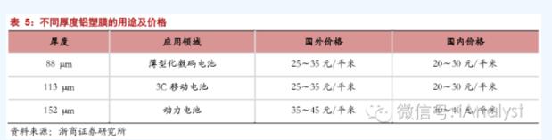 目前鋁塑膜厚度一般分別三擋,即86~88μm、113~123μm、152~153μm,分別用于薄型化數碼電池、3C移動電池、動力電池,國內外價格如表5所示,88μm和113μm的價格區(qū)間基本一致,153μm的價格更高一些。在過去的幾年里,鋁塑膜的價格有一定程度的下調,主要是韓國栗村化學、日本T&T以及部分國產鋁塑膜開始實現(xiàn)對外供應,市場競爭有所加大,例如2015年鋁塑膜的均價降幅超過10%。雖然鋁塑膜價格有所下降,但成本端同樣在下降,所以一般在實現(xiàn)量產后,鋁塑膜的毛利率仍然可以達到50%左右,屬于高附加值產品。