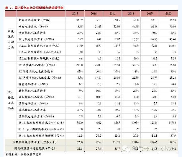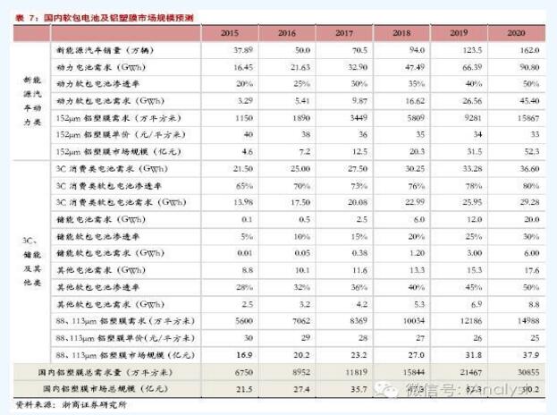 對于未來國內軟包電池市場對鋁塑膜的需求,我們進行詳細的估算,如表7所示。