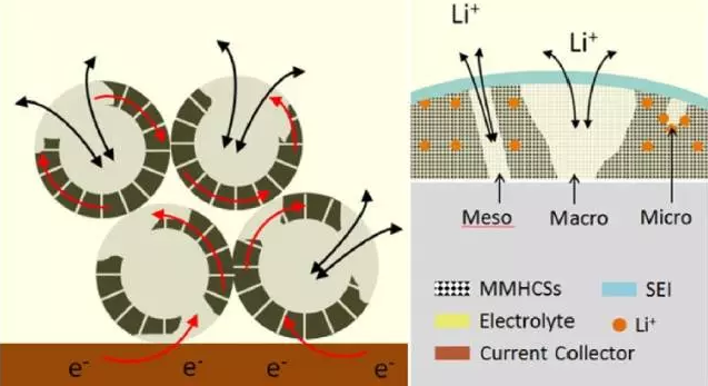 近日北京理工大學的Xinyang Yue等人基于介孔碳技術開發(fā)了一種微孔-介孔中空碳微球鋰離子電池負極材料,該材料的比表面積高達396m2/g,該材料不僅具有高容量特性,并且具有良好的循環(huán)性能,在2.5A/g的電流密度下,循環(huán)1000次仍然保持530mAh/g的比容量。該材料的倍率性能也十分讓人震驚,在60A/g的電流密度下(約為100C),該材料比容量仍然可達180mAh/g。