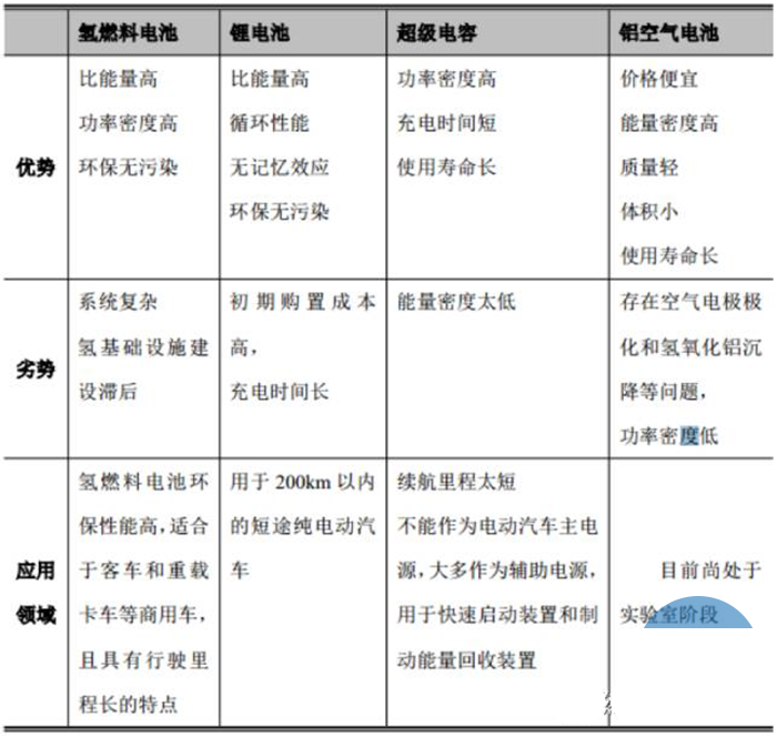 目前在交通運輸用動力源方面,主要有四種技術(shù)路線:鋰離子電池、氫燃料電池、超級電容和鋁空氣電池。其中鋰離子電池、超級電容和氫燃料電池得到廣泛的應(yīng)用,而鋁空氣電池尚處于實驗室研究階段。能源補給方面,鋰離子電池、超級電容適用于純電動汽車,但是需要外部充電,而氫燃料電池汽車則需要外部氫氣加注,鋁空氣電池則需要補充鋁板和電解液。就目前來看,鋰離子電池在未來相當長的一段時間內(nèi)還是要占據(jù)主要發(fā)展空間的。