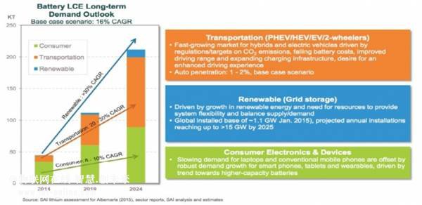 發(fā)展中國家--如中國、印度等國家智能手機市場的持續(xù)擴大,將能夠保證全球對鋰或其他電池材料一直有較高的需求量;不過筆記本電腦和舊式便攜設備的銷量下滑也意味著,這一細分市場的需求可能并不會如預期那樣增長;高新科技市場--如可穿戴設備和智能手表的發(fā)展也將有助于鋰電池需求的增長;不過汽車和可再生能源這一新興市場預計將在未來十年才能進一步擴大。
