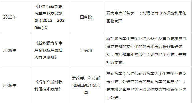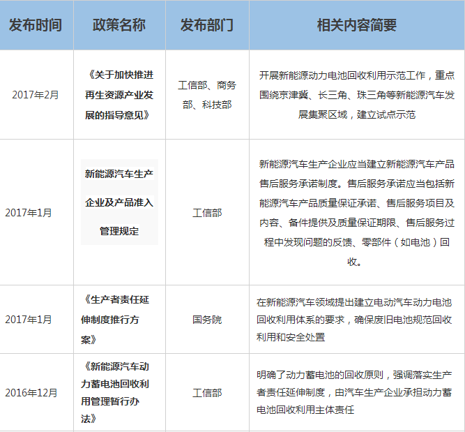 隨著動力電池回收問題日益顯現(xiàn),國家的相關(guān)政策開始落實,只2017年國家就連續(xù)發(fā)布了3個相關(guān)政策,督促電池回收發(fā)展。前不久,三部委下發(fā)《關(guān)于加快推進再生資源產(chǎn)業(yè)發(fā)展的指導(dǎo)意見》,將在京津冀、長三角、珠三角等新能源汽車發(fā)展集聚區(qū)域,建立試點示范;1月份,工信部頒布《新能源汽車生產(chǎn)企業(yè)及產(chǎn)品準入管理規(guī)定》明確了新能源汽車產(chǎn)品售后服務(wù)承諾制度,其中特別標注了電池回收;同月,國務(wù)院頒布《生產(chǎn)者責(zé)任延伸制度推行方案》,明確了“誰生產(chǎn),誰負責(zé)”的原則。