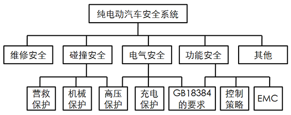 純電動汽車的安全系統(tǒng)要求涉及碰撞安全、電氣安全、功能安全以及維修安全等,安全體系組成如下圖所示: