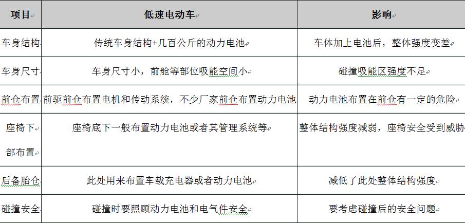 標(biāo)準(zhǔn)草案中有兩條主線,即“符合安全要求”和“使用鋰電池”。本文主要結(jié)合純電動汽車的技術(shù)特點,分析為了達(dá)到安全要求,低速電動車的車身及動力電池布置需要重點考慮的技術(shù)問題。
