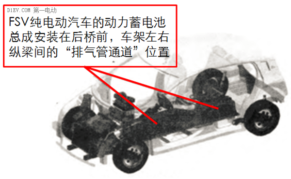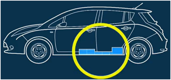 日產(chǎn)Leaf車的總體布置同樣遵守了“蓄電池組安裝在車架的兩縱梁之間和后橋之前、前橋之后”這一原則,如下圖所示。