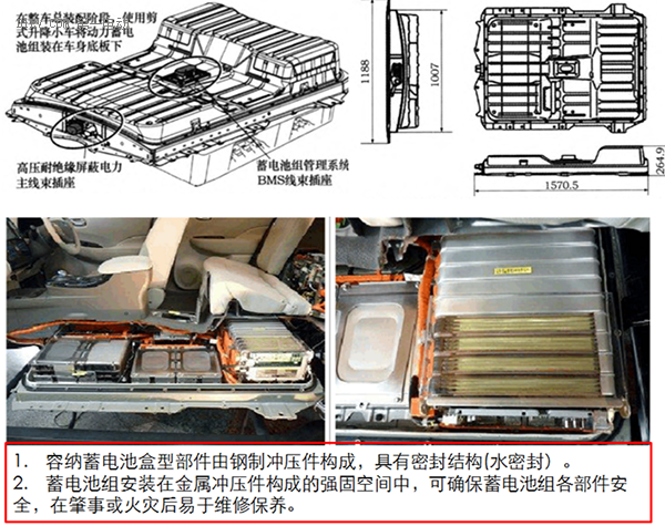 Leaf車的動力蓄電池組及電力主線束和BMS電池組管理系統(tǒng)均安裝在具有水密性的由鋼板沖壓制成的“蓄電池組容器”中,不僅能確保車輛發(fā)生碰撞時,動力蓄電池組、電力主線束和BMS系統(tǒng)不受損傷,而且可確保雨天行駛和一定深度的淺涉水行駛的安全性。