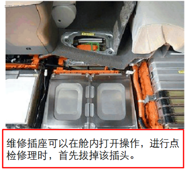 乘員直接觸及蓄電池組和其他高壓電力系統(tǒng)的部件(包括DC/DC升壓器、DC/AC逆變器、主線束/高壓絕緣屏蔽電力電纜以及插接件)會導(dǎo)致觸電,因此它們均需具有保護外套/障壁(包括橡膠絕緣、金屬網(wǎng)屏障及塑料封閉外殼等)防護,避免乘員直接觸及。最為重要的是上述保護裝置不得在未使用工具的情況下被打開、拆開或移除。下圖為聆風(fēng)的維修插頭設(shè)置: