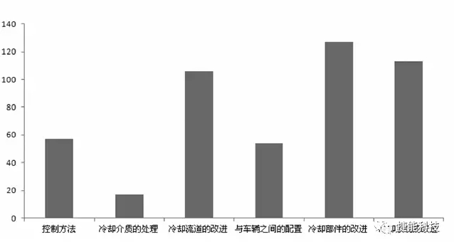 電池散熱研究主要集中在冷卻部件的改進(jìn)、冷卻系統(tǒng)的設(shè)計(jì)、冷卻流道的設(shè)計(jì)上,其次是冷卻控制方法和冷卻裝置與車輛之間的配置,有少部分專利涉及到對冷卻介質(zhì)的處理。