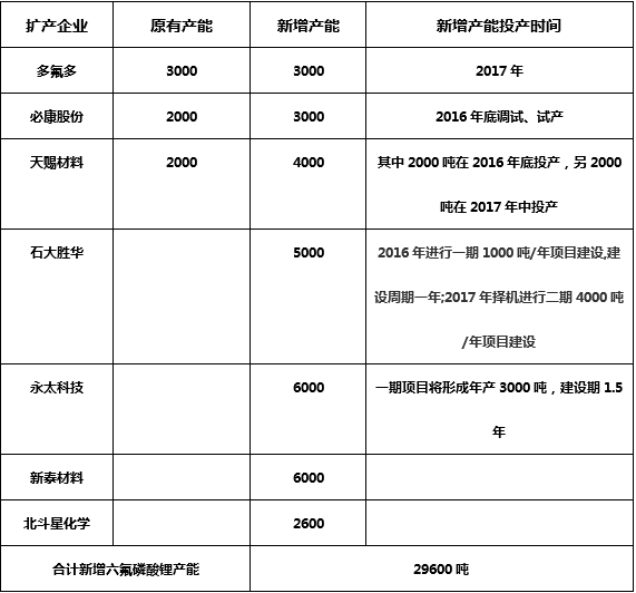 2016年7月5日,永太科技也公告稱,公司控股子公司邵武永太高新材料有限公司擬以自有資金38760萬元投資建設年產6000噸六氟磷酸鋰和2000噸新型鋰鹽項目。一期項目將形成年產3000噸六氟磷酸鋰和1000噸新型鋰鹽的生產能力,建設期預計為1.5年。
