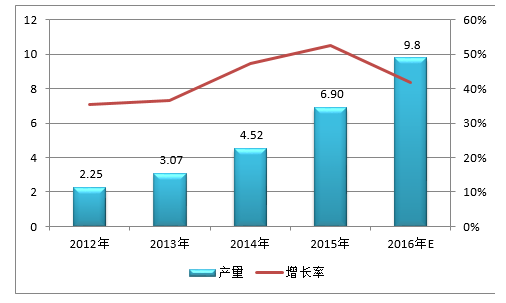 賽瑞研究統(tǒng)計數據顯示,2015年,全球電解液整體產量為11.1萬噸,同比增長34.3%;中國電解液產量為6.9萬噸,同比增長52.7%;從增長速度來看,中國電解液產量的增長速度明顯高于全球。2016年中國電解液產量為9.8萬噸,同比增長42.03%。