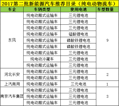 2017年3月1日發(fā)布的第二批新能源汽車(chē)推薦目錄中,共有13家企業(yè)29款純電動(dòng)物流車(chē),其中25款車(chē)型選用三元鋰電池,3款車(chē)型選用磷酸鐵鋰電池,1款選用錳酸鋰電池,如下表所示: