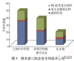 對排名前三的企業(yè)專利申請方向進(jìn)行了分析,進(jìn)而了解三大企業(yè)的專利技術(shù)布局及技術(shù)側(cè)重點(diǎn),三大公司的研發(fā)重點(diǎn)基本一致,主要集中在碳材料、復(fù)合金屬氧化物及錫/硅類復(fù)合材料,碳材料類及錫/硅類復(fù)合材料的研究成果要遠(yuǎn)遠(yuǎn)大于復(fù)合金屬氧化物。