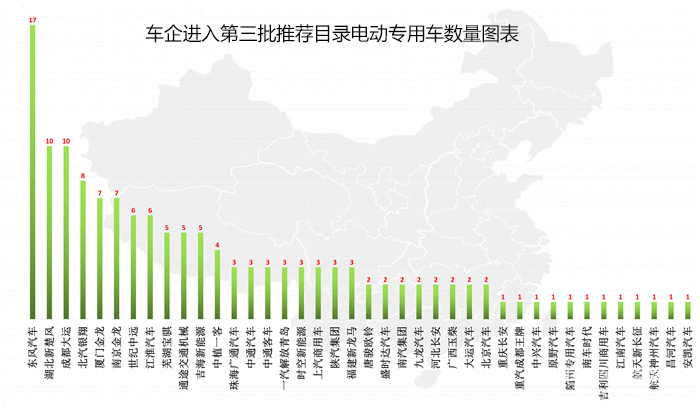 在第三批推薦目錄中,有40家電動(dòng)專(zhuān)用車(chē)生產(chǎn)企業(yè)進(jìn)入,它們的電動(dòng)專(zhuān)用車(chē)進(jìn)入情況如下: