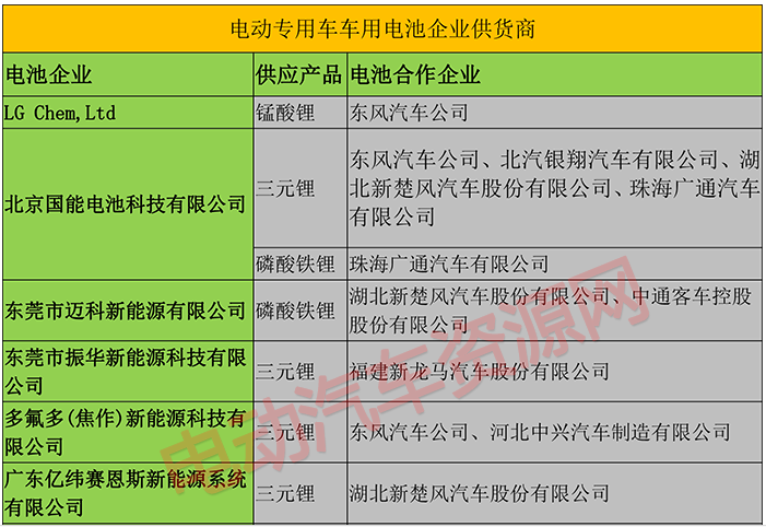 在142款車(chē)型中,有32家動(dòng)力電池企業(yè)與該目錄的車(chē)型有配套。其中,有26家電池企業(yè)提供三元鋰電池,有7家電池企業(yè)供給磷酸鐵鋰電池,只有2家電池企業(yè)供給錳酸鋰電池。值得一提的是在這些企業(yè)中,LG化學(xué)與東風(fēng)汽車(chē)有合作。以下是各動(dòng)力電池企業(yè)供貨以及與車(chē)企合作情況: