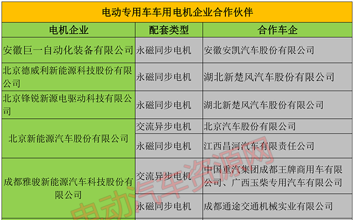 在第三批推薦目錄142款電動(dòng)專(zhuān)用車(chē)中,49家電機(jī)企業(yè)與該目錄車(chē)型配套,其中42家企業(yè)提供永磁同步電機(jī),10家企業(yè)提供交流異步電機(jī)。以下是電機(jī)企業(yè)與車(chē)企合作情況:
