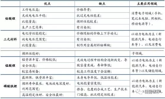 由于鈷酸鋰、錳酸鋰、磷酸鐵鋰以及三元材料等正極材料的優(yōu)缺點(diǎn)各有不同,因此各有主流的應(yīng)用下游。