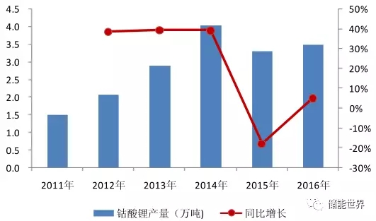 受下游筆記本電腦、數(shù)碼相機(jī)等消費(fèi)電子市場增速放緩以及多元金屬鋰復(fù)合氧化物其它鋰電池正極材料替代等因素影響,鈷酸鋰產(chǎn)量增速有所放緩,2016年期產(chǎn)量 3.49 萬噸,同比增長 5.12%,低于同期消費(fèi)電子類鋰電池的增長速度。