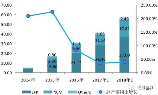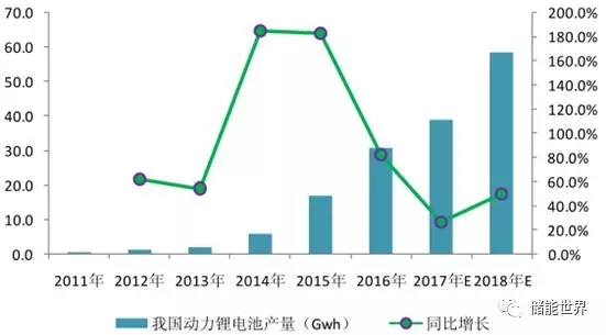新能源汽車市場的快速發(fā)展,促進(jìn)了對動力鋰電池的需求。數(shù)據(jù)統(tǒng)計(jì)顯示,受2016我國新能源汽車產(chǎn)量同比增速超過 36%,2015 年底生產(chǎn)的部分整車補(bǔ)裝電池以及 2009-2013 年生產(chǎn)的部分整車需要換裝電池等因素影響,致 2016 年我國動力電池產(chǎn)量 30.80Gwh,同比增長 82.25%。預(yù)計(jì)到 2018 年,我國汽車動力電池產(chǎn)量將達(dá)到 58.46Gwh,2016-2018 年,年均復(fù)合增長率達(dá)到 37.77%。到 2020 年,我國汽車動力電池產(chǎn)量將達(dá)到 75Gwh,2016-2020 年,年均復(fù)合增長率達(dá)到 25%。