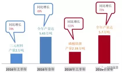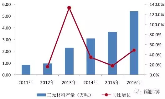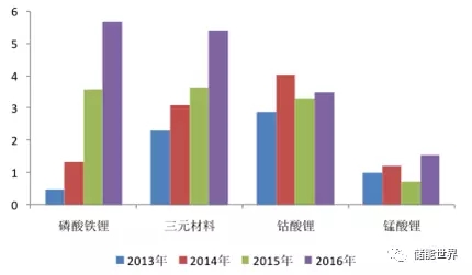統(tǒng)計(jì)數(shù)據(jù)顯示,2016 年中國鋰電三元材料產(chǎn)量 5.43 萬噸,同比增長 48.8%;產(chǎn)值 79.8 億元,同比增長超過 60%,在四種正極材料中其產(chǎn)值占比最高。