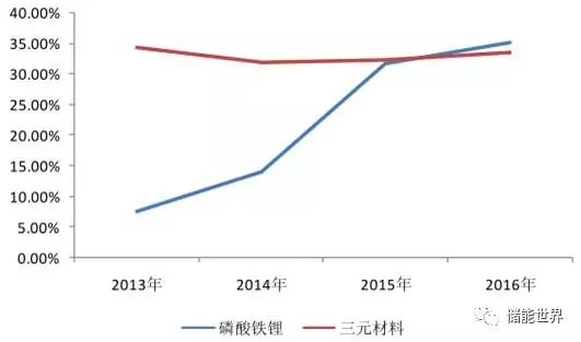 而受動力型鋰電池需求的快速增長,促進(jìn)動力型鋰電池正極材料的快速發(fā)展。目前國內(nèi)動力型鋰電池主要以鐵系和三元系為主,故近兩年磷酸鐵鋰和三元材料成為鋰電池正極材料中增長最快的兩種材料。2016 年兩者的出貨量增速均超過45%,具體來看,磷酸鐵鋰的產(chǎn)量(含企業(yè)自產(chǎn))5.7 萬噸,同比增長 75%,磷酸鐵鋰大幅增長主要受動力電池及儲能鋰電池帶動。三元材料產(chǎn)量 5.43 萬噸,同比增長 49%,增長主要受新能源乘用車、鋰電自行車、中低端數(shù)碼鋰電池等市場帶動,其中,磷酸鐵鋰目前在正極材料生產(chǎn)總量中占比最大,2016 年占比達(dá)到35.27%。