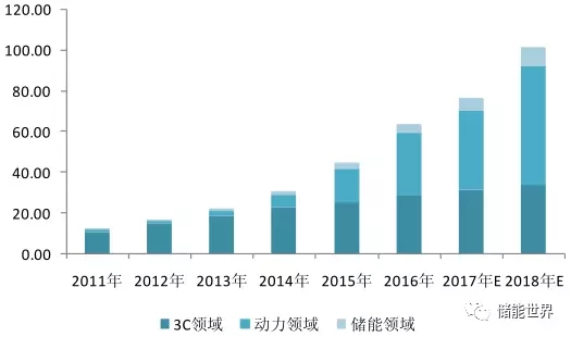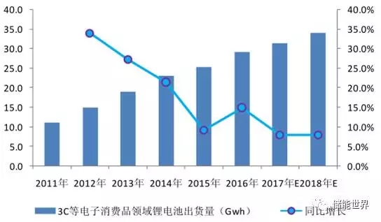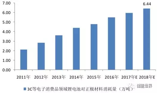 目前 3C 等電子消費(fèi)品主要以鈷酸鋰鋰電池為主,但也有部分三元系鋰電池。按照目前的鋰電池生產(chǎn)工藝,每 Ah 鋰電池消耗正極材料約 7.0g,預(yù)計(jì)到 2018 年將帶來近 6.5 萬噸正極材料的年需求量。