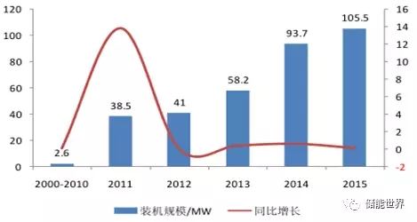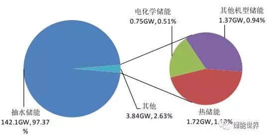 儲能技術(shù)主要分為物理儲能(如抽水儲能、壓縮空氣儲能、飛輪儲能等)、化學(xué)儲能(如鉛酸電池、全釩液流電池、鈉硫電池、鋰離子電池)和電磁儲能(如超導(dǎo)電磁儲能、超級電容器儲能等)三大類。具體裝機(jī)情形看,目前抽水儲能發(fā)展最快,也是目前裝機(jī)容量中占比最高的一種。2015 年,全球儲能裝機(jī)量已近 150GW:從技術(shù)分布來看,截至 2015 年年底,全球累計(jì)運(yùn)行的儲能項(xiàng)目裝機(jī)規(guī)模達(dá)146.1GW,占總裝機(jī)量的 97.4%,我國累計(jì)運(yùn)行的儲能項(xiàng)目累計(jì)裝機(jī) 23.7GW,排名全球第二。