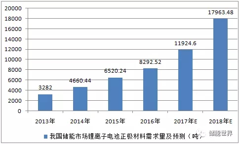 若儲能鋰電池電壓按照 3.2V 計(jì)算,則 1Gwh 儲能鋰電池需要正極材料約2,188.00 噸。而以此估算,2016 年我國儲能領(lǐng)域鋰離子電池正極材料市場需求約為 8,292.52 噸,預(yù)計(jì)到 2018 年將達(dá)到 17,963.48 噸,2015 年-2018 年儲能領(lǐng)域鋰電池正極材料的市場需求量年復(fù)合增速超過了 40%。