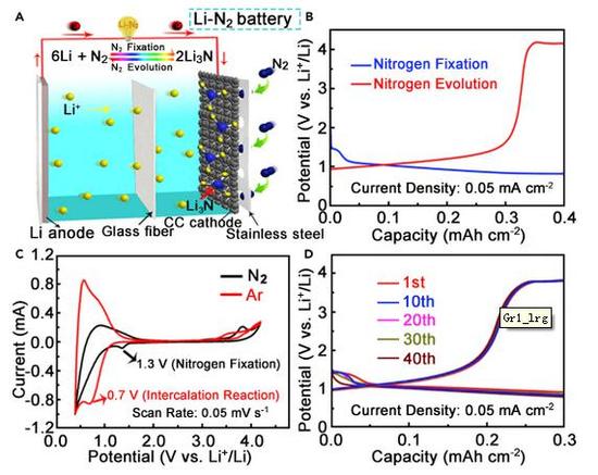 在室溫條件下,該款Li-N2電池的結(jié)構(gòu)及再充電性(rechargeability)如下:圖(A)Li-N2電池結(jié)構(gòu)圖,含有金屬鋰箔陽(yáng)極(Li-foil anode)、基于醚類(lèi)的電解質(zhì)及共陰極(CC cathode)。圖(B):電流密度為0.05 mA/cm2時(shí),帶共陰極的Li-N2電池的氮?dú)夤袒€(N2 fixation curves)(藍(lán)色)及氮?dú)庋莼€(N2 evolution curves)(紅色)。圖(C):掃描頻率為0.05 mV/s時(shí),在氮?dú)怙柡痛髿猓ê谏┘皻鍤怙柡痛髿庀拢t色),Li-N2電池的控制點(diǎn)曲線(CV curves)。圖(D):電流密度為0.05 mA/cm2時(shí),Li-N2電池的循環(huán)性能。