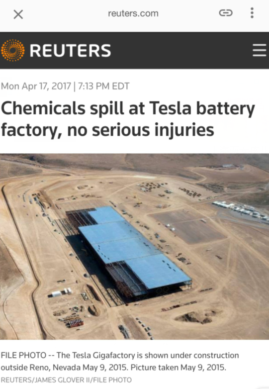 特斯拉還表示,緊急工作人員正在對(duì)內(nèi)華達(dá)州特斯拉公司電池廠周一泄漏有害物質(zhì)進(jìn)行調(diào)查。