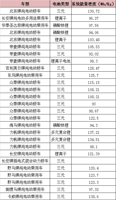 從系統(tǒng)能量密度來(lái)看,電池系統(tǒng)能量密度達(dá)120Wh/kg以上的純電動(dòng)乘用車達(dá)11款,占新能源乘用車總數(shù)量的41%,可獲得1.1倍補(bǔ)貼,均為三元電池。另外3款磷酸鐵鋰均不超過(guò)100Wh/kg。