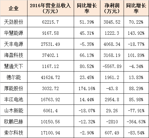 高工鋰電統(tǒng)計,截至目前,已經(jīng)有包括天勁股份、華慧能源、天豐電源、海盈科技、慧通天下、德爾能、厚能股份、豐江股份、山木新能、歐朋巴赫、索爾科技等11家新三板鋰電池企業(yè)發(fā)布了2016年報。