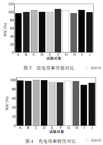 GB/T31486以動(dòng)力電池在3C電流強(qiáng)度放電來考核其放電倍率;以2C電流強(qiáng)度充電,且充電時(shí)長(zhǎng)控制在30min內(nèi),來考核電池的充電倍率特性。放電倍率特性對(duì)比如圖3所示;充電倍率特性對(duì)比如圖4所示。