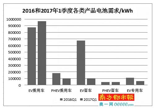 崔東樹(shù)認(rèn)為,由于補(bǔ)貼減少,今年一季度以及4月的新能源汽車銷售總體同比放緩,也就意味著電池的需求量下降。這一點(diǎn)也體現(xiàn)在真鋰研究機(jī)構(gòu)的報(bào)告中,2017年1季度EV客車的電池需求量?jī)H10 .21萬(wàn)kWh,與2016年同期的67.68萬(wàn)kWh相比,降幅高達(dá)85%。E V專用車的電池需求也有較大幅度下降,2017年1季度的6萬(wàn)kW h需求與2016年同期11 .3萬(wàn)kWh相比,幾乎減半。報(bào)告分析,這兩大市場(chǎng)對(duì)補(bǔ)貼政策的變化極為敏感,很大原因在于3萬(wàn)km累積行駛里程要求的政策顯示了威力。