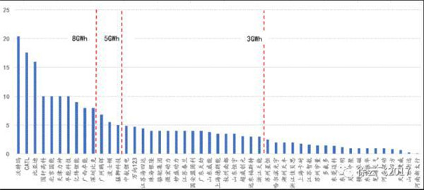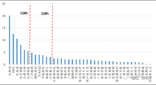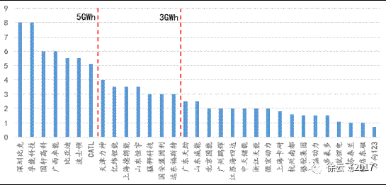 從產能格局來看,龍頭企業(yè)基本上沒有大的變化,沃特瑪(20.4GWh)、CATL(18GWh)、比亞迪(16GWh)繼續(xù)位列前三,國軒高科、波士頓、北京國能、天津力神、孚能科技緊隨其后。