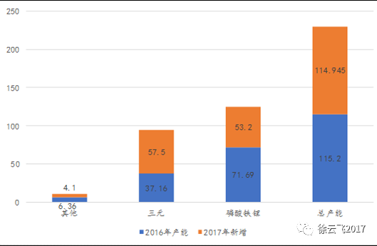 新增產能集中在三元鋰電,占比提升至41%。2017年底預計磷酸鐵鋰電池新增產能53.2GWh,擴產后產能達124.91GWh,占總產能比例為54%,較16年下滑8個百分點。而三元電池新增產能57.5GWh,擴產后94.69GWh,占比增加9個百分點至41%;其他類型電池新增產能約2.1GWh,擴產后約為10.5GWh,占比下降至5%。