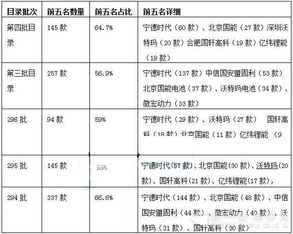 第三批目錄中,前五名的電池企業(yè)裝配客車數(shù)量為257款,占新能源客車總數(shù)的56.9%。