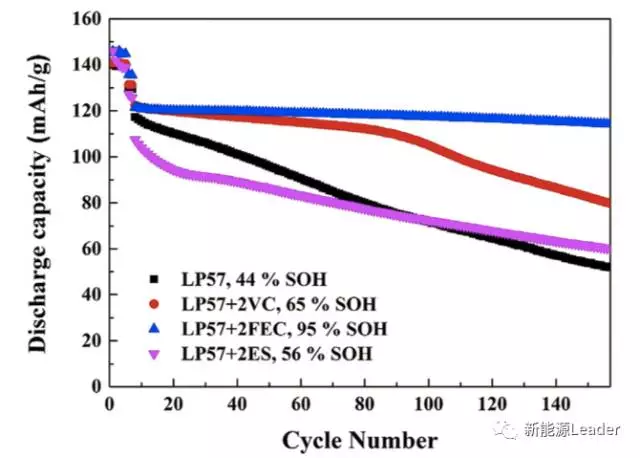 提高鋰離子電池比能量的另外一個重要的方法就是控制電解液的數(shù)量,減少電解液的數(shù)量可以有效的提高鋰離子電池的能量密度。電解液在鋰離子電池內(nèi)部起到一個媒介的作用,正負(fù)極的Li+通過電解液進(jìn)行擴散,因此電解液理論上來講是一種“非消耗品”,只要有少量的電解液保證Li+在正負(fù)極之間自由擴散就行了,但是實際上由于在化成過程中SEI膜的形成導(dǎo)致電解液分解,以及在循環(huán)過程中SEI膜破壞和正極氧化等原因造成的電解液分解,導(dǎo)致電解液在實際上是持續(xù)消耗的,因此電池內(nèi)的電解液一般而言都是過量的,這也是導(dǎo)致鋰離子電池比能量低的一個重要原因,為了減少電解液量,同時保證電池的性能,需要我們對電解液溶劑體系和電解液添加劑體系進(jìn)行改進(jìn),提高電解液的穩(wěn)定性。為了改善電解液在三元材料NMC電池中的穩(wěn)定性,德國明斯特大學(xué)的Yunxian Qian等[2]向傳統(tǒng)的EC和EMC(重量比為3:7)為溶劑的電解液中添加了少量的FEC添加劑,發(fā)現(xiàn)FEC添加劑能夠有效的減少電解液的分解,提高NMC電池的首次庫倫效率,并顯著改善電池的循環(huán)穩(wěn)定性。