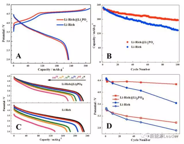 隨著我們對鋰離子電池能量密度的要求不斷提高,傳統(tǒng)的LiCoO2材料已經(jīng)物法滿足高比能鋰離子電池的需求,為了進(jìn)一步提升鋰離子電池的能量密度,我們有兩個大方向可以選擇:1)提高鋰離子電池的工作電壓;2)提高正負(fù)極材料的容量。首先我們從第1)方面來分析一下提高鋰離子電池能量密度的可行性,鋰離子電池的工作電壓取決于正負(fù)極材料之間的電壓差,目前負(fù)極材料石墨的電壓已經(jīng)很低(約0.1V vs Li+/Li),進(jìn)一步降低的空間并不大,提升鋰離子電池電壓主要從正極材料方面進(jìn)行著手,目前可供選擇的高電壓材料主要有以下幾類:(1)高電壓的尖晶石鎳錳酸鋰LiNi0.5Mn1.5O4材料,其工作電壓可達(dá)5.0V,電壓平臺在4.7V左右,理論容量為147mAh/g,實際容量可達(dá)138mAh/g以上。(2)橄欖石類的高電壓材料,例如LiMnPO4和LiCoPO4材料等,其中LiMnPO4材料的電壓平臺可以達(dá)到4.1V左右,LiCoPO4材料的更是可以達(dá)到4.8V左右。(3)富鋰材料,富鋰材料的理論容量可達(dá)200mAh/g以上,甚至是300mAh/g,但是為了發(fā)揮出富鋰材料高容量的優(yōu)勢,需要將其工作電壓提高,甚至達(dá)到4.8V左右。這些高電壓材料除了要解決自身存在的問題外,還面臨著一個同樣的問題:高電壓下電解液不穩(wěn)定的問題,目前商用的鋰離子電池電解液一般是基于碳酸酯類的有機電解液,溶劑鹽為LiPF6,這也導(dǎo)致在高電勢下,電解液極易被氧化分解,導(dǎo)致電池的性能嚴(yán)重下降,甚至發(fā)生安全問題。為了克服這一難題,我們可以從兩個方面進(jìn)行著手,首先是從電解液溶劑體系方面,為了提高電解液的電化學(xué)穩(wěn)定窗口,可以采用更為穩(wěn)定的離子液體電解液和新型的電解質(zhì)鹽。另一方面,為了減少高電壓材料對電解液的氧化,可以對高電壓材料進(jìn)行表面的包覆處理,從而隔離電解液與活性物質(zhì)。華南師范的大學(xué)的Dongrui Chen等[3]利用Li3PO4對富鋰層狀材料進(jìn)行了表面包覆處理,Li3PO4包覆顯著改善了富鋰材料的循環(huán)性能,減少了過渡金屬元素的溶解,抑制了層狀結(jié)構(gòu)向尖晶石結(jié)構(gòu)的轉(zhuǎn)變。