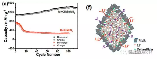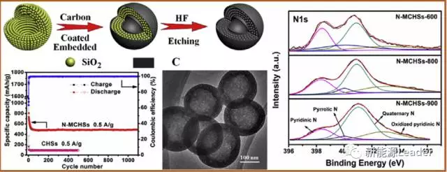 高容量的負(fù)極材料方面,我們主要有以下幾個選項:1)硅基材料;2)N摻雜石墨類材料;3)過度金屬S化物類材料;4)金屬鋰負(fù)極。硅負(fù)極材料不需多說,這也是目前市場上最為成熟可靠的高容量負(fù)極材料,晶體Si的比容量可達(dá)4200mAh/g以上,但是膨脹大、循環(huán)性能差,SiOX雖然容量稍低(1500mAh/g左右),但是循環(huán)性能優(yōu)異,缺點是首次效率低。N摻雜石墨材料是近年來高容量負(fù)極材料的一個研究熱點,N原子的電負(fù)性為3.5左右,在石墨中摻入N元素后,可以顯著的提高石墨負(fù)極的比容量,武漢大學(xué)的Kaifu Huo等[4]利用模版法制備了N摻雜介孔碳中空球材料,其在0.1A/g的電流密度下,比容量可達(dá)931mAh/g,0.5A/g的電流密度下,循環(huán)1100此,仍然能夠保持485.7mAh/g的比容量。