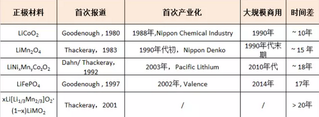放眼過去二三十年鋰離子電池的技術發(fā)展歷程,我們就可以很清楚地看到技術進步的緩慢和艱辛。筆者這里以最具代表性的正極材料的產(chǎn)業(yè)化進程來闡述這個問題。表二比較了幾種主流的鋰電正極材料首次被公開報道的年份、首次被工業(yè)化的時間以及大規(guī)模商用的時間。我們可以清楚你看到,這幾種主流正極材料從最開始被公開報道到大規(guī)模生產(chǎn)與應用,所經(jīng)歷的時間跨度其實是越來越長了!